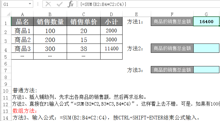 方法:输入公式:=SUM(B2:B4*C2:C4),按CTRL+SHIFT+ENTER结束公式输入。