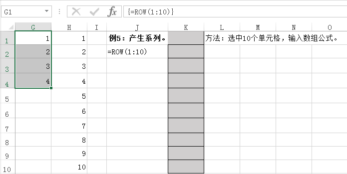 在G列中,选中的为4行,但输入的是1:10,得到结果是给出选中行数的序列数。