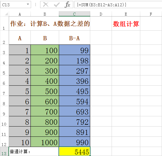 B与A之差的求和,可直接使用数组计算,公式为:=SUM(B3:B12-A3:A12)