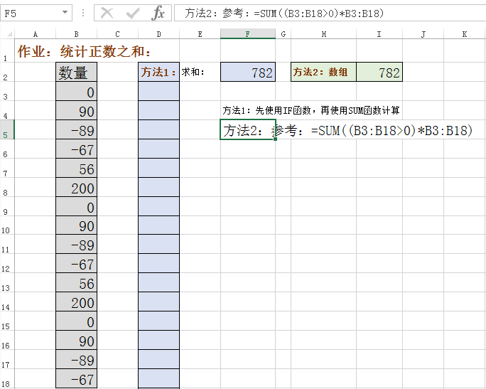 统计正数之和,方法有二:SUMIF求和;SUM数组判断逻辑值依次乘积求和(个人认为SUMIF操作简便,公式方便阅读领会)。
