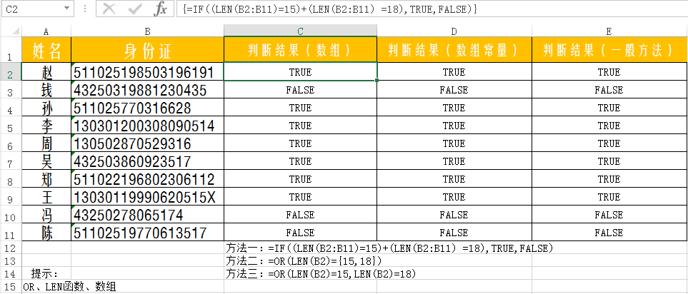 判断身份证长度是否正确,方法有三,数组整体判断;单一单元格数组常量判断;或函数OR一般方法(个人认为数组整体判断操作直观,公式便于阅读理解)。