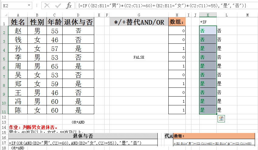 方法二:=IF((B2:B11="男")*(C2:C11>=60)+(B2:B11="女")*(C2:C11>=55),"是","否")