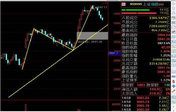 大盘分析:昨日大盘高开高走,尾盘又有所回落,收根中小阳线,目前大盘依然在上升通道中,今日大盘在3050左右有支撑,大盘依然看涨!