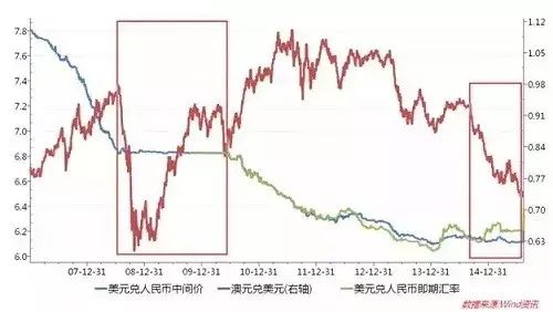 从官方的表述来看,中间价是对做市商的报价加权平均得到的。我们观察美元兑人民币与澳元兑美元的走势对比,不难发现澳元走势的波动程度要明显高于人民币,尤其是左框标注的次贷危机引发全球金融危机的时间段,和右框标注的美联储退出QE后加息预期升温的时间段,人民币中间价走势都过于平稳。这表明我国人民币中间价的形成机制并不够市场化,不透明的中间价决定机制体现的更多的是央行的意志,尤其在市场动荡时基本上与美元挂钩(表现为中间价基本持平),维稳的意图非常明显。