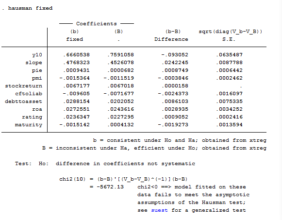 Note: the rank of the differenced variance matrix (6) does not equal the number of coefficients being tested (10); be sure this is what you expect, or there may be problems computing the test. Examine the output of your estimators for anything unexpected and possibly consider scaling your variables so that the coefficients are on a similar scale.