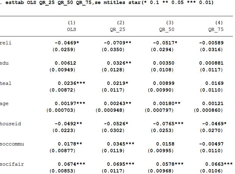 风雨阁主人 发表于 2016-4-18 08:39 已解决了,谢谢大家。直接esttab OLS QR_25 QR_50 QR_75 using mx.rtf,se mtitles star(* 0.1 ** 0.05 *** ...
