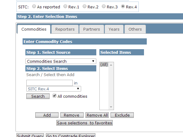 各位大神,我正搜集世界各国STIC行业相关数据,但是在UNCOMTRADE里step2 search/select items不知该怎么填,求大神们告知,不胜感激么么哒....