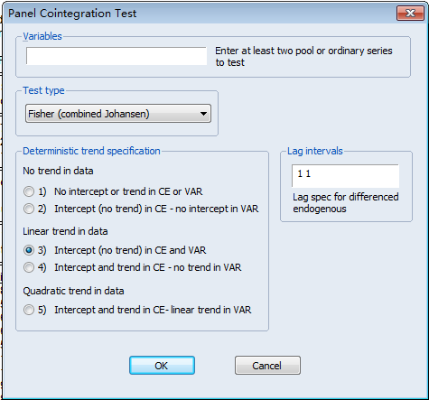 1、面板数据JJ协整检验中,左下角的1~5选项,应该根据什么来选择。为什么很多时候都默认选3呢?