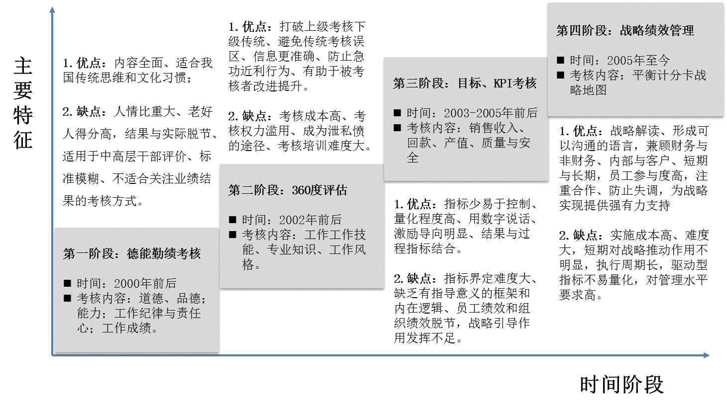 当然,这只是一个大致的分类标准,时间界限并非十分明显。虽然当前以平衡计分卡战略地图为基础的战略绩效管理在中国已经大行其道,但仍然有很多企业事业单位在采用“德能勤绩”的考核方式和“360度评估”方式。处于不同发展阶段的企业所采用的绩效管理手段并不相同。整体上,基于战略实施和经营业绩提升的战略绩效管理已经成为主流,这也是本书要重点阐述的内容。