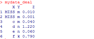 > mydata$X[which(mydata$Z<0.04)]<-"MISS"