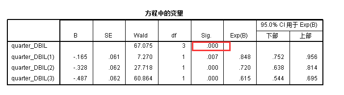 yatouha 发表于 2016-4-20 20:35 这是spss Cox回归分析的结果,quarter-DBIL为分类变量,一共有四个水平,以最高水平为参照,请问红色框中的 ...