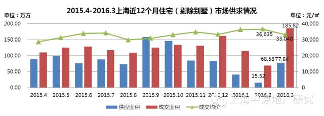 2016年后上海市住宅供应有所回升,3月全市住宅推案77.84万方,环比大幅上涨401.61%,成交面积达185.82万方,环比上涨170.97%,成交量创12个月新高,均价环比下跌9.79%至3.30万元/㎡。