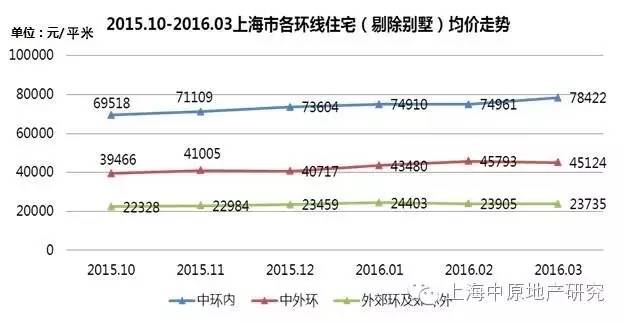 近半年,上海市各环线住宅均价稳中有升,上海中环内二手房房价及中外环涨幅较快,分别为12.8%及14.2%,外环外涨幅较小6.3%。由此可得,3月成交量虽较2月上涨170.97%,但76%成交来自房价较低的郊区,均价较高的中环内成交较少,所以虽然成交量创新高,但郊区成交量大导致均价有所下滑。