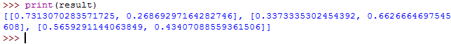 [[0.7313070283571725, 0.26869297164282746], [0.3373335302454392, 0.6626664697545608], [0.5659291144063849, 0.43407088559361506]]