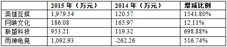 英雄互娱、网映文化、联盛科技、雨神电竞公司2015年营收分别是均超过1900万元,其中英雄互娱公司营收高达1.07亿元。相比2014年,这4家电竞企业2015年营收涨幅均超过100%。其中,雨神电竞公司的营收暴涨高达560.27%,英雄互娱增幅达393.07%。后者业绩增长的主要原因是2015年该公司主营业务转向了移动游戏领域,其中移动游戏《全民枪战》月流水突破亿元。因此,公司业务成功转型是营收增长的主要因素。