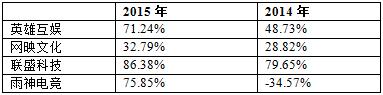 以上4家电竞公司2015年毛利率超过70%的有3家,其中联盛科技毛利率高达86.38%;网映文化毛利率最低,达32.79%。相比2014年,这4家企业2015年的毛利率均有所提升,其中变动最大的是雨神电竞公司,该公司毛利率由上年度-34.57%提高到本期75.85%。另外,英雄互娱公司2015年毛利率上升幅度也比较大。