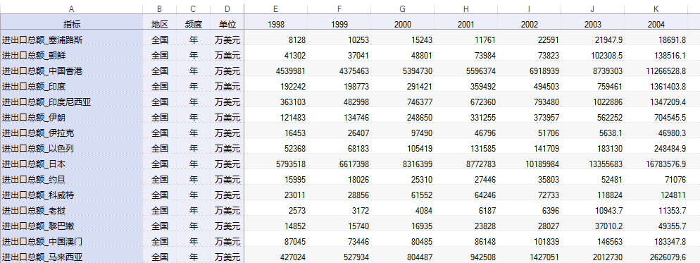 中国是全球各国分国别的每年进出口总额、进口总额、出口总额的统计数据。包含全球、亚洲、欧洲、大西洋洲、非洲、美洲等区域的数据。