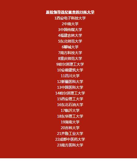 观海解局(微信ID:guanhaijieju)记者以“大学”为关键词,在中纪委官网上搜索发现,自2013年9月2日中纪委监察部网站开通至今,至少已有23所大学的36人因涉嫌违纪被查,其中28名任党委书记、校长或副校长等领导职务。