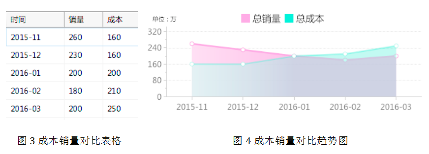 再如图3和图4所示,成本销量趋势图非常直观的揭示出,整体利润的下降是成本持续增高导致的。以上的图形都简洁明了的说明了数字的含义。一图胜千言,一图解疑惑。正因为如此,数据可视化成为了一种趋势。可视化的数据成为了人与人,人与数据,人与业务之间进行沟通的最便捷方式。