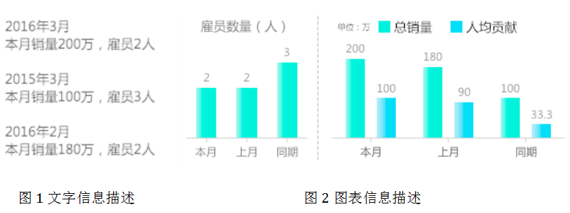 可是老板很忙的,然后老板很快就忘记了你做的事情。如果想让老板印象深刻,该怎么做?这个时候就用到数据可视化。数据可视化是用更直观和易于理解的,进行信息分享和沟通的方式,通过图表等设计方式,缩短信息的表达,同时给老板深刻的印象。下面我们就对比文字描述和数据可视化两种方式来做展示。