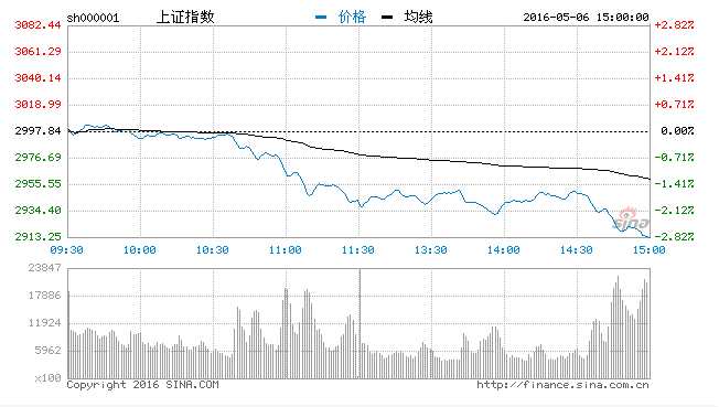 5月6日消息,周五早盘,盘初沪指小幅下探后快速走高,冲破3000点。好景不长,在壳资源、通用航空等板块的拖累下,沪指震荡下挫翻绿。10:30左右沪指跳水急跌。午后开盘,沪指在低位维持弱势震荡,临近尾盘,券商股出现异动,山西证券(12.70, -0.40,-3.05%)率先翻红,然而无力护盘,沪指继续下杀。截至收盘,沪指报2913.25点,跌幅2.82%,深成指报10100.54点,跌幅3.57%,创业板报2129.19点,暴跌4.27%。