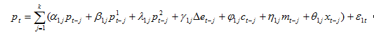 我利用VAR模型进行汇率传递效应研究,模型是即p与多个变量的滞后做VAR检验,然后汇率e只采用滞后三阶进行检验,那这样出来结果之后汇率的短期乘数和长期乘数是多少?
