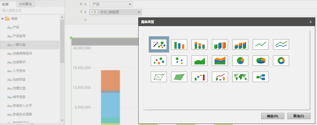 3.可以更改所使用的任意图表类型,包括饼图、柱图、散点图、雷达图、地图、帕累托图、流向图、气泡、词云等不同的展现形式。