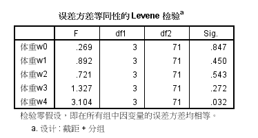 如图2,MANOVA结果中,最后一周误差方差等同性的 Levene 检验 p <0.05