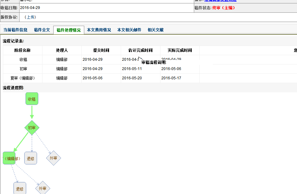 ayayay10 发表于 2016-5-24 11:31 我刚查了下,今天进了终审。没有外审的情况下进入终审感觉希望不大,我也不等了,已经投了别的刊。