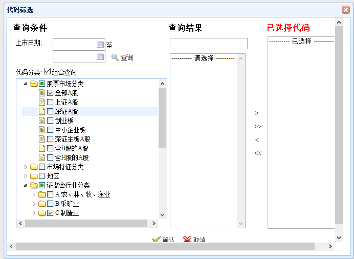 代码筛选:组合查询 全部A股+制造业 (如图1)