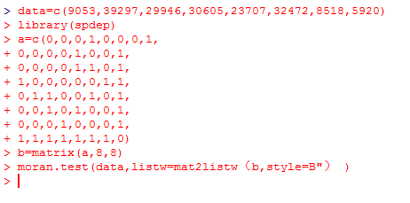 我的地区只有八个分区,所以我手动写的空间权重矩阵