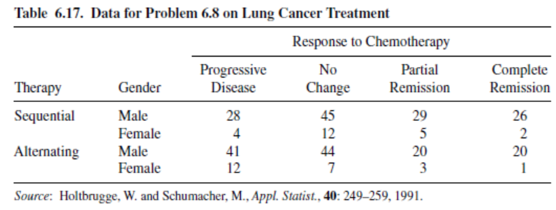 Table 6.17 results from a clinical trial for the treatment of small-cell lung cancer. Patients were randomly assigned to two treatment groups. The sequential therapy administered the same combination of chemotherapeutic agents in each