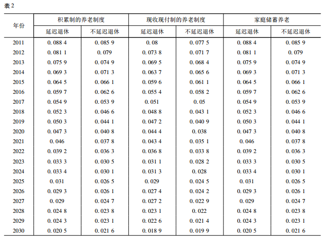 [摘 要] 本文采用动态规划的方法,在维持生育政策不变的情景下考察三种养老制度和两种退 休方案对中国宏观经济的影响。研究发现: 首先,在总产出、人均产出、社会总福利以及人均福利上, 家庭养老和ZF主导的积累制养老模式都好于ZF主导的现收现付制养老模式,且家庭养老轻微好 于ZF主导的积累式养老模式,由于家庭养老更多着眼于经济效率,ZF养老更多着眼于社会公平, 从社会公平和经济效率的综合角度讲,宜优先选择ZF主导式的积累制的养老模式。其次,在总产 出、人均产出及社会总福利上,延迟退休要好于保持退休制度不变的情景; 在人均社会福利上,延迟 退休低于保持退休制度不变的情景,源于在生命有限和风险厌恶的情况下,延迟退休意味着必须工 作更长的时间,在不工作时间内领取更少的养老金,以及更多地增加当期的储蓄份额。最后,如果国 家基于总产出、人均产出及社会总福利最大化视角,同时兼顾社会公平,应该实行积累的养老制度和 延迟退休的方案组合; 如果想最大化地提高居民人均福利水平,同时注重社会公平,建议实行积累的 养老制度和维持退休制度不变的方案组合。当然,无论是哪种养老制度和哪种退休方案,在模型设 定的理论框架下都无法改变未来中国经济增速下降的趋势。上述研究可能为中国正在或者将要制 定的养老政策和退休制度提供部分参考。