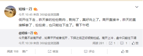 昨日的本来定的策略是今日下探可以买,但是今日并为开新仓。原因上午我就发在微博里了:因为如果今日平开或低开后直接下探,昨日被套的,正好割完,然后直接向上走,但是今日直接大幅高开,并且高开后还上冲的了一下,那昨天被套的上午好不容易解套了,所以纷纷卖,结局是盘中只能向下走。