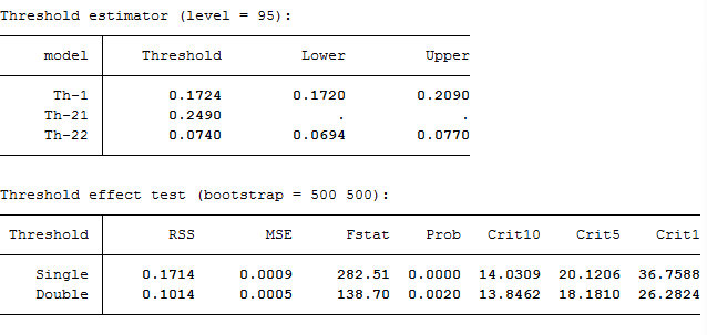 星期天的早晨 发表于 2016-5-26 14:24 你的问题可能很简单,你这个只有一个门槛值,这是因为,一般在两个或以上的门槛时,Th-1和Th-21的门槛估计值 ...