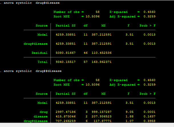 anova systolic drug#disease 則只看 drug和disease 的交互作用。