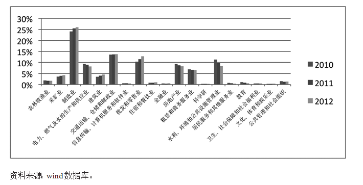 图 9 中,第三产业中的交通运输、仓储和邮政业、批发零售业、房地产业、租赁和商务服务 业等四个行业的比值大于 1,说明它们占用了相对比较多的信贷资源,而从服务业发展方向来看,
