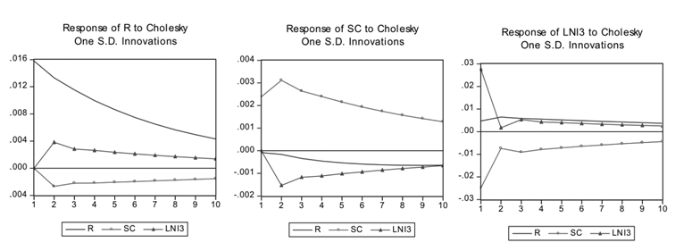 在 VAR 模型的基础上,设定脉冲为残差的 1 个单位的冲击,冲击期限为 10 期,可以得到各 变量相互作用的脉冲响应函数,如图 8。