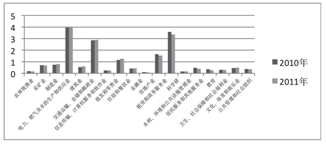用行业信贷量占总信贷规模比重除以该行业产值占比,得到行业信贷错配程度,如果等于 1, 则没有错配,大于 1,则说明该行业占有了过多的信贷资源,小于 1,则相反。本文计算了 2010 年和 2011 年我国各行业的信贷错配情况,如图 9 所示。