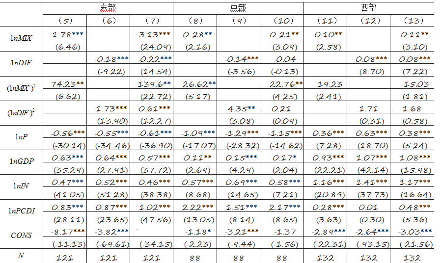 上文分析了全国整体层面产业结构调整对工业用地集约利用水平的影响,考虑到我国各地区 工业发展与产业结构调整均存在差异,接下来分东部、中部和西部分别进行估计测算,检验各区 域产业结构调整对当地工业用地集约利用水平的影响,估计结果如表 2 所示。