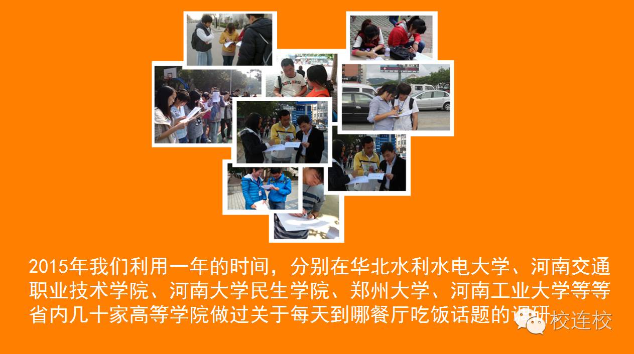 2015年校连校利用一年的时间,分别在华北水利水电大学、河南交通职业技术学院、河南大学民生学院、郑州大学、河南工业大学等等省内几十家高等学院做过关于每天到哪餐厅吃饭话题的调研。甲类学生反映:“学校餐厅的饭都一个样,大同小异,没啥吸引人的地方,每天总是为“填饱肚子”而吃饭”;乙类学生反映:“感觉学校外面的饭比较好吃吧!很多时候学习忙的时候,会选择叫些外卖!但就是大多情况下学校门卫不让外卖进,所以身边的朋友也只能偷偷的叫外卖”;丙类同学反映:”我来学校大半年了,还不知道学校有个3号餐厅!”