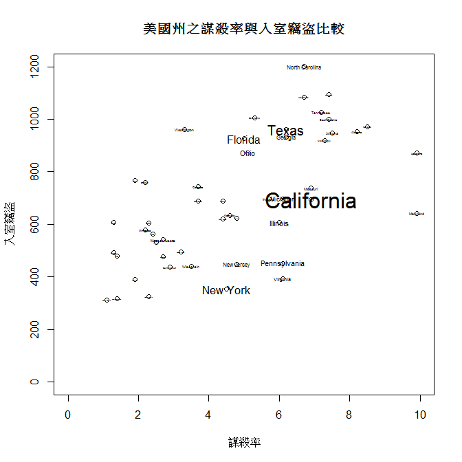 使用第一列資料"state(州名)",分析第二列"murder(謀殺率)",及第六列"burglary(入室竊盜)",並使用最後一列"population(人口數)"做為大小依據。