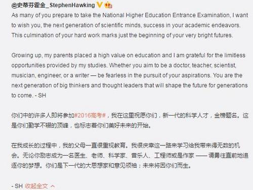 2016高考前一天——霍金发文鼓励考生:未来将因你们而生