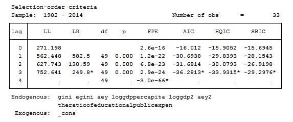 STATA小白一枚!求教各路大神,varsoc这个结果怎么理解呢?AIC,HQIC还有SBIC的结果代表什么呢?