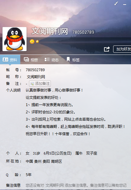 2015年9月22日在网站上看到《文阅期刊网》这个页面,并加了其QQ 780502789与之交流了解这个灰色的市场,10月29日看到有介绍因公司周年庆优惠代发的消息,因为长期投稿无音讯,于是就心动了,咨询了一下价格也不是很贵,大概在3000元到5000元之间就能包法CSSCI,于是就从中选择了其中比较牛X的《经济科学》杂志发表,双方约定价格为3500元,把文章发过去后,预先支付给对方提供的账号一般的费用,即1750元。按照对方的话说,另一半费用要等收到杂志社录用通知书,查稿确定后支付。但是,这人心太急,我才将1750元打过去并将文章发过去的第二天一大早就给我邮箱发经济科学杂志社的录用通知书,让我缴清余下的费用,这引起了我的怀疑,找同学朋友商量的同时发邮件给《经济科学》杂志社的老师询问是否有收到过我的文章并同意录用,对方很快回复邮件告知并无此事:未收到稿件,也未委托任何结构和个人代收组稿。大家肯定这是一场骗局,于是我选择报案,经过裂解后警方以金额不足且网络诈骗难以追查为由不能受理。最后,只能吃哑巴亏了。 从我被骗的整个过程来看,我总结出以下几点心得: