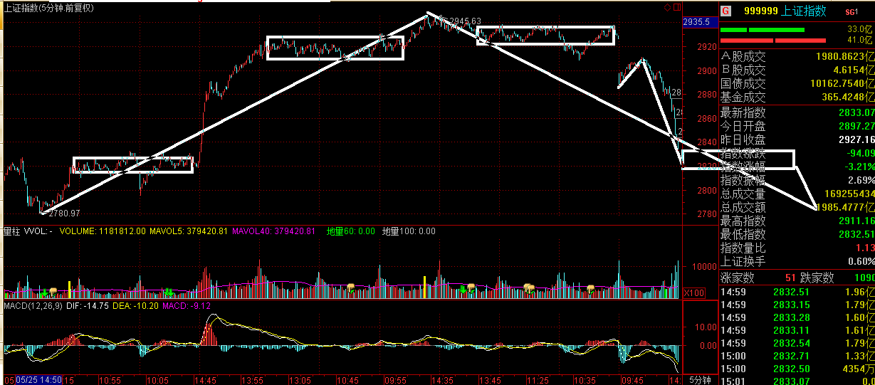 指数全天震荡,按照昨天的预期构建第二个5分钟图上的中枢,成交量能后曾宪萎缩状态。目前指数走势完全在预期之内,从日线上看,昨日大阴线之后出现缩量震荡状态,预计这种走势还会持续一到两个交易日,小阴小阳线都是可以接受的。短期均线已经出现死叉,预计后几个交易日,20日均线将成为上方巨大压力,逾越的可能性比较低。
