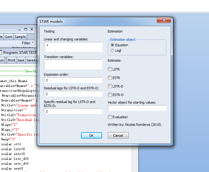 rt,我已经加载插件,以序列x为例,我已经检验出来最优的滞后阶数为2,通过非线性检验,d的滞后阶数为4,确定模型方程为LSTAR,怎么估计方程,求前辈们赐教。还有,我不知道这个插件是检验什么的都包括了的吗?还是要自己先检验,有知道的人指点一下。