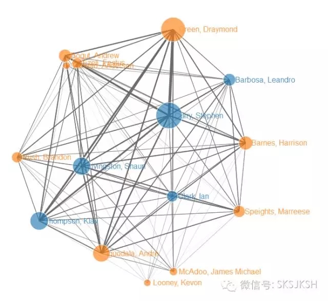 在上图中,蓝色表示接球,橙色为传球,而连线越粗则表示接传球数量越多。我们从图中可以发现大多数的进攻是从 Stephen Curry和Draymond Green间相互传球开始的;并且联盟 MVP Curry 接到了大多数的传球,而团队中的 MVP Green则发动了最多的传球。