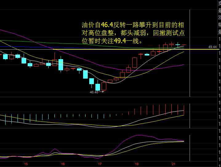 隔夜凌晨美原油7号合约已经完成了最后交易,今天开始我们以美原油8号合约进行分析。从日线上看,布林带走平,价格突破中轨运行其上方,同时MA5自六连阴向下穿过MA10、20之后目前还是向上运行的状态,目前下方支撑先关注49.4一线附近。从四小时图看,K线整体形态自46.4美元反转上行到目前的这个相对的高位开始了盘整,多头力度正在减弱,MA5依旧是价格的强支撑,附图指标MACD的红色动能柱也在减弱,KDJ在超买区汇聚走平。综合分析,在多头趋势依旧的情况下,我们等回落的机会低位做多。