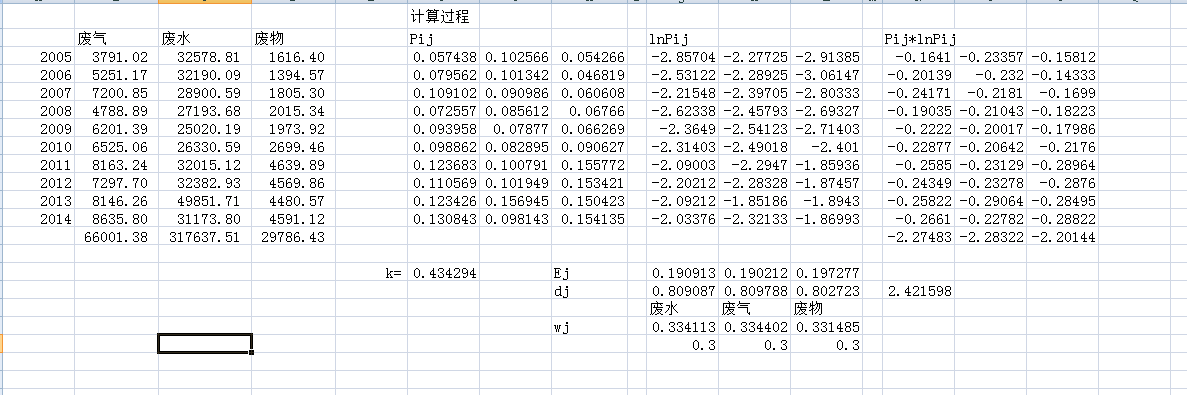 我使用excel做的熵值法求权重,十年数据,有废水废气废物三个指标,算出来的权重都是0.3+,想问一下这种情况是不是算的有问题,还是我数据设置的有问题,这个excel算熵值法对数据有什么要求吗?还望各位大神赐教!这是数据的计算过程,请问有什么问题吗?